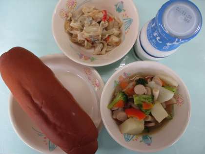 給食では、大きく切った野菜やウインナーをコンソメでじっくり煮込んでいます。素材の味を感じていただきました。