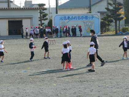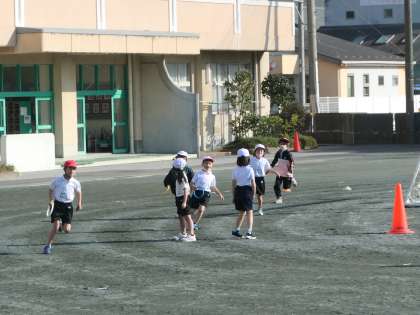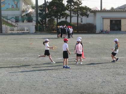 今日の体育の時間は、運動場でリレーを行いました。リングをバトン代わりにしてリレーを行っていました。全力疾走する姿が見られました。