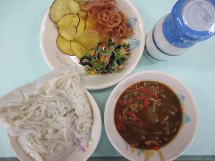 和風カレーソフトめん・牛乳・さつまいもとれんこんチップス・三色和え