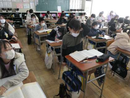 今日の国語の時間は、柿山伏について説明している「柿山伏について」の文を読んで、どのようなことが説明されているかを読み取ってまとめていました。能狂言の楽しみ方について筆者の伝えたいことをまとめていました。