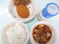 ご飯、牛乳、煮みそ、わかさぎのから揚げ、こがね和え