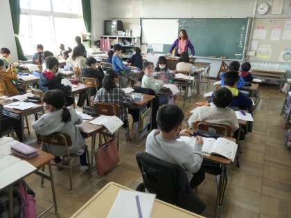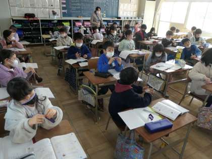 2年生の算数では、分数の学習をしています。今日は、もとの大きさを同じ大きさで二つに分けたものをリボンで作ることで、2分の1の分数を学んでいました。