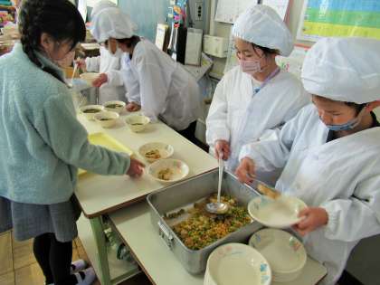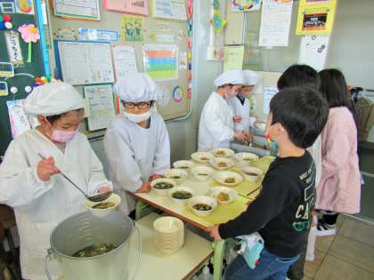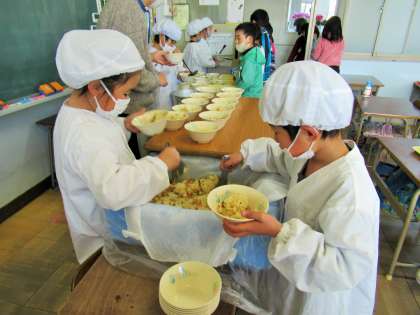 小学校に入学して、給食当番が回ってくるのを楽しみにしている1年生の子どもたち。今週の給食当番は、今日が最後となりました。4月当初は、汁やご飯をよそう手つきを冷や冷やして見ていましたが、今では上手によそうことができます。任せることができます。