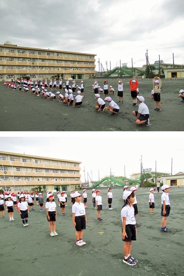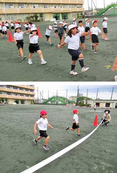 雨上がりの運動場で、スポーツフェスティバルの練習をしました。昨日練習した行進や駆け足をしたり、みんなでかけ声をかける練習をしたりしました。また、40m走ではゴールテープを用意して練習をしました。
