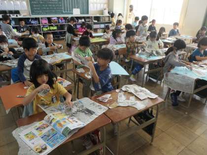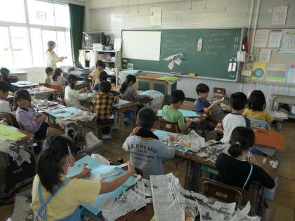 今日の図工の時間は、新聞紙を破いて偶然できた形をはり合わせて絵を完成させていました。工夫をして新聞紙を破きながら制作していました。楽しい絵が完成していました。