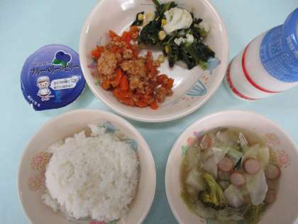 カラフル丼・牛乳・コンソメスープ・ブルーベリーゼリー