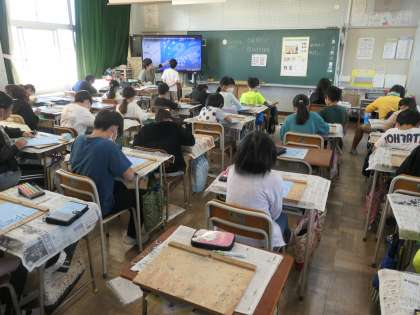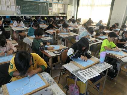 図工の時間ん版画の制作をしています。今日は、下絵の書いた版木を彫刻刀で彫っていました。中心になる生き物から彫り進めていました。完成が楽しみです。