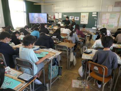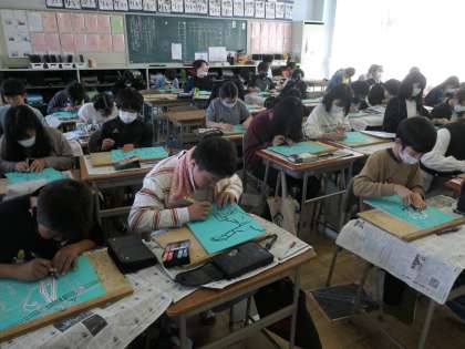 6年生は、6年生の思い出のカラー版画の制作をしています。今日は、下絵にそって、丸刀で彫り進めていました。丸刀で彫ると線が柔らかくなっていました。