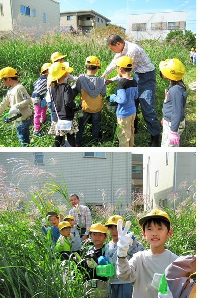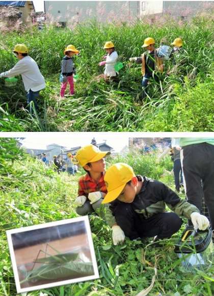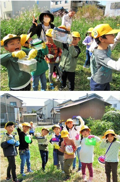 草をかき分けて、どんどん草むらに入っていき、バッタやコオロギをつかまえる子がいる一方、「いない。いない。」と、一匹もつかまえることができない子もいました。しかし、初めて虫とりをする子や、初めてバッタをつかまえたという子もいて、子どもたちにとって貴重な体験となりました。