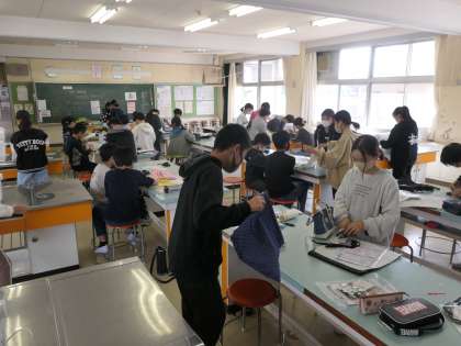 今日の家庭科の時間は、ナップザックを完成させていました。ひもを通して背負うことができるようにしていました。もうすぐ修学旅行です。完成した作品はその時に活用してくださいね。
