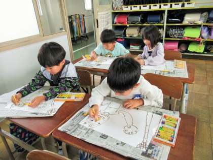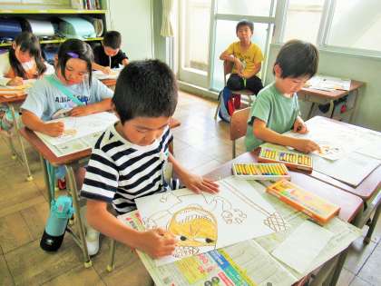玉をつかんでいる手を強調して描きました。自分のバンダナの色は、嬉しそうに塗っていました。