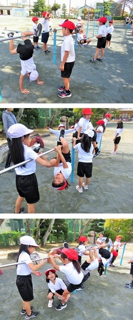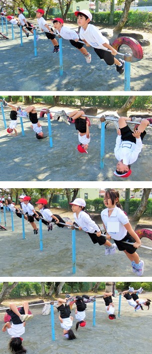 先週に続き、今日の体育の時間も鉄棒の練習をしました。すでに、いろいろな技が出来る児童が先生になって、アドバイスをしたり、補助をしたりして練習をしました。