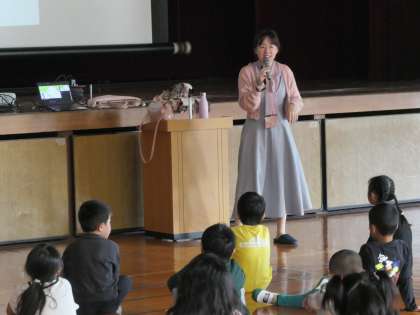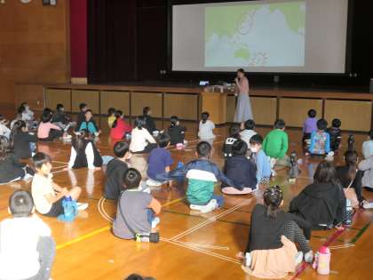 今日は、ニュージーランドから日本に来ている国際交流員のアリスさんに来校していただき、ニュージーランドについてのお話を聞かせてもらいました。ニュージーランドがある場所やその生活についてお話をしていただきました。興味がわいてきたかな。