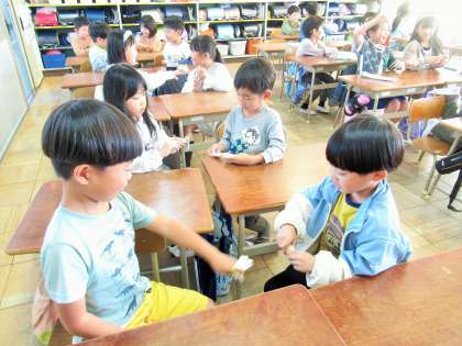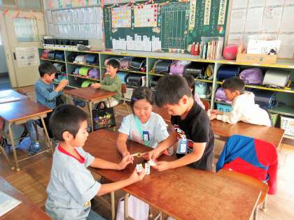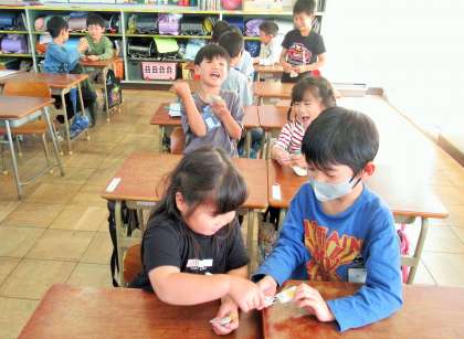 これからは、頭の中で計算して速く答えを出す練習をしていきます。今日は、計算カードの式を出し合って、どちらの答えが大きいか比べるゲームをして楽しみました。