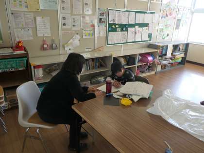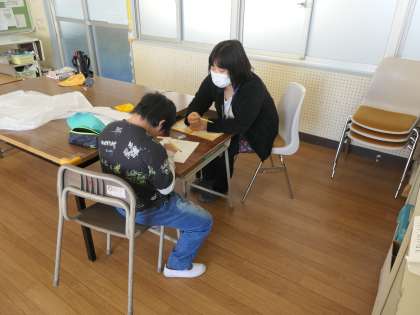 今日は、先生と一緒に算数の学習を進めました。プリントを使って学習をすすめていました。しっかり学習に取り組めていました。
