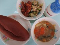 今日のこんだて ソフト麺・牛乳・さつまいもと大豆の甘がらめ・和風カレーソフト麺献...