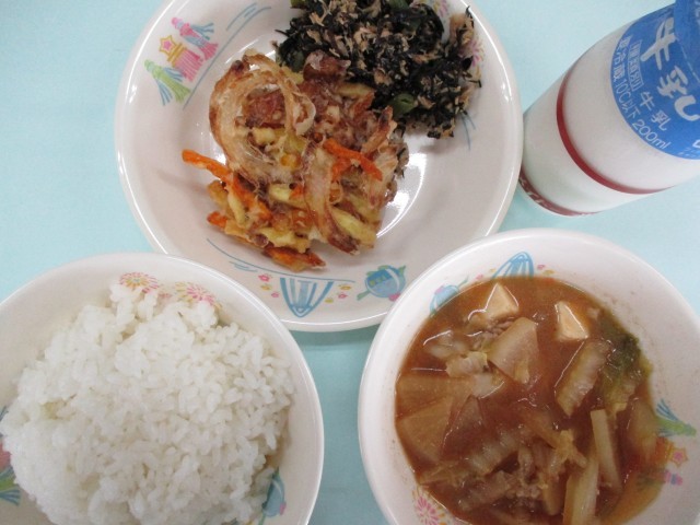 今日のこんだて ご飯・牛乳・手作りかき揚げ・ひじきのいため煮・豚汁献立メモ 今日...