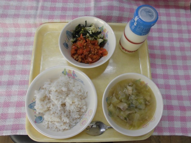 牛乳・麦ごはん・人参のカラフル丼(具)・カラフルサラダ・ABCマカロニスープ