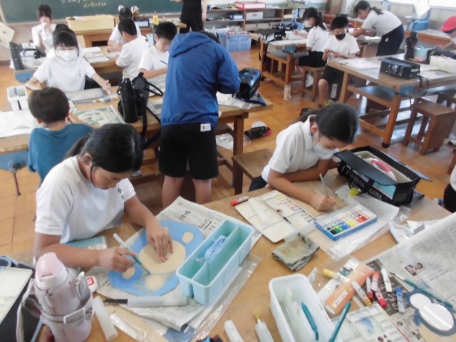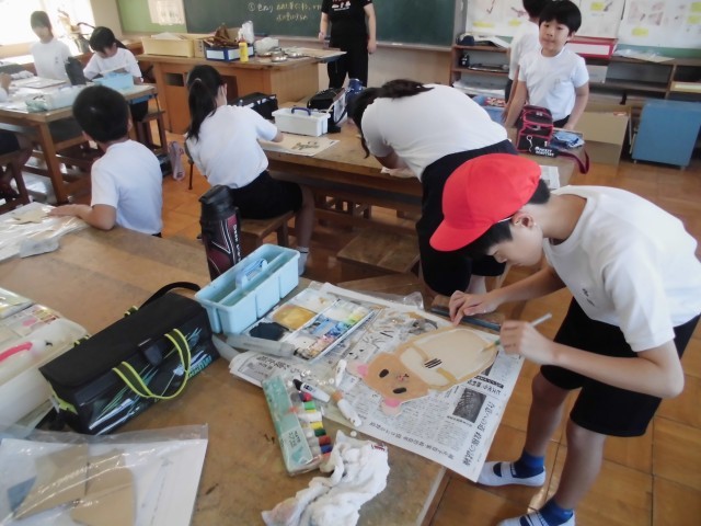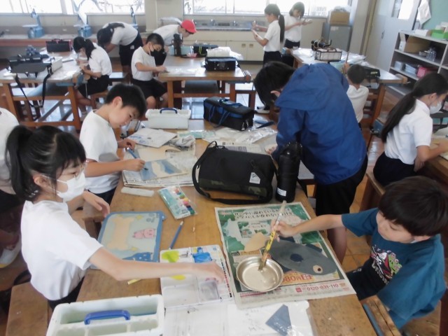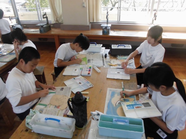 図画工作の時間には、電動糸のこぎりを使って板を切り、オリジナルのホワイトボードを制作しています。みんな集中して取り組んでいます。