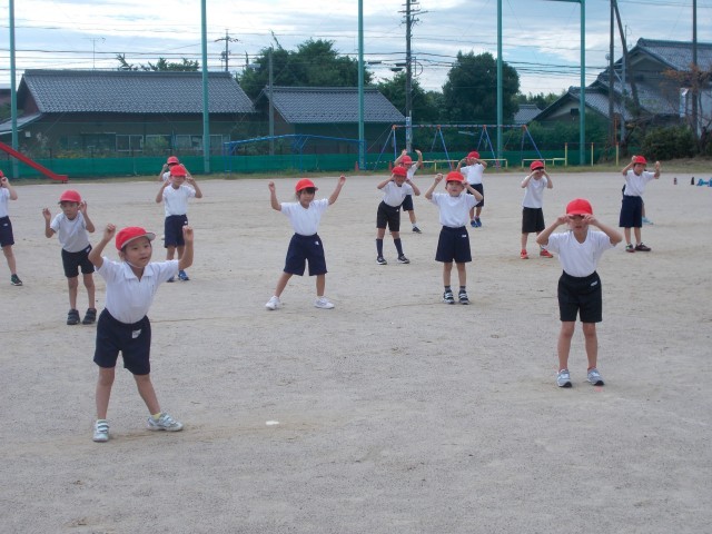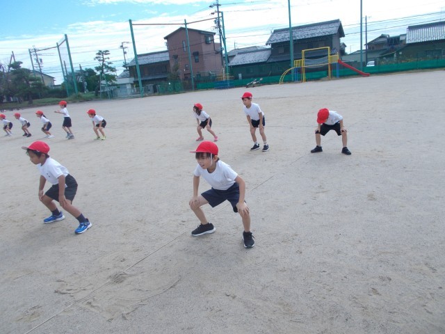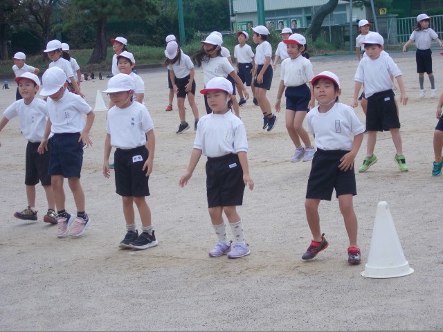今日は、運動会の表現の練習を運動場で行いました。隊形移動をしながら踊る練習をしました。
