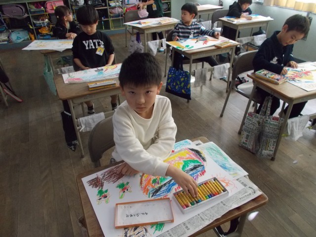 読書感想画に取り組んでいます。担任による「11ぴきのねこ」の読み聞かせから、自分のかきたい場面を思い浮かべ画用紙に描きました。