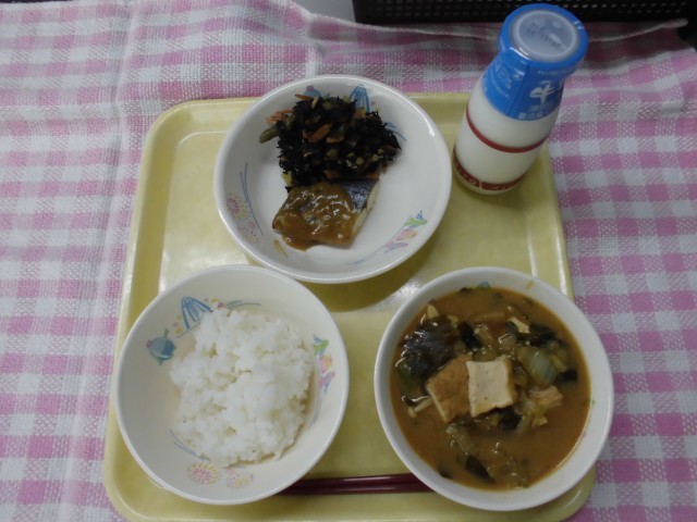牛乳・ご飯・さわらのごまだれ・栗入りひじきの炒め煮・呉汁