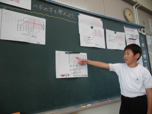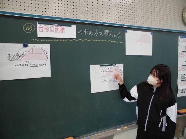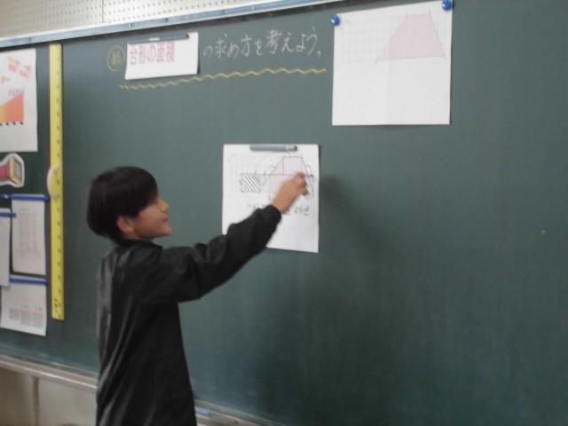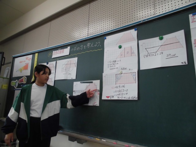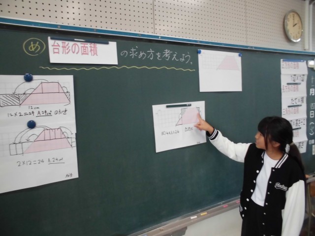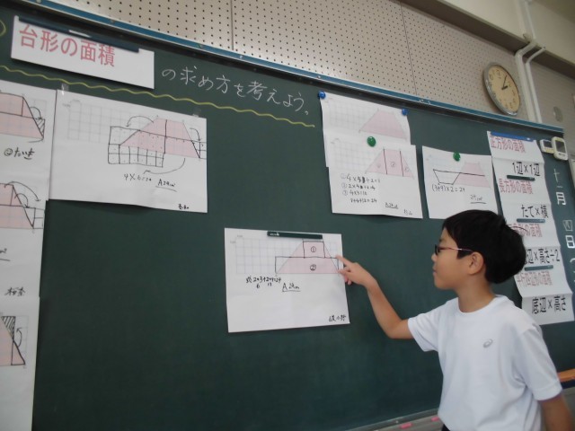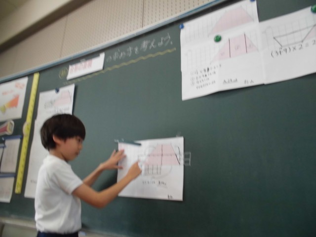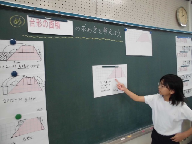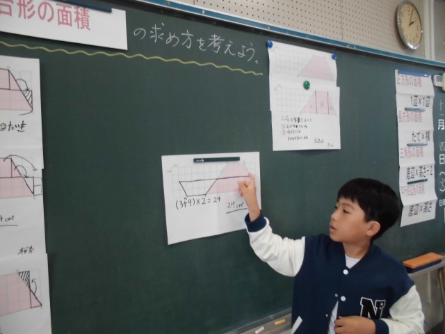 算数の授業では、台形の面積の求め方について考えました。今日もたくさんの子が自分の考えを発表することができました。