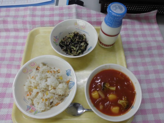牛乳・鶏ごぼうピラフ・ひじきのサラダ・ニョッキのトマト煮