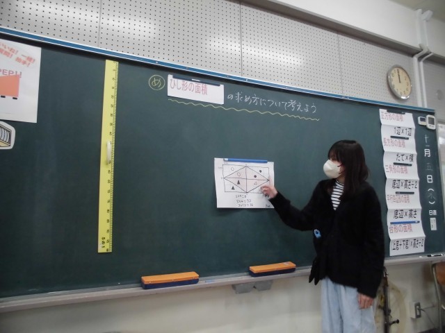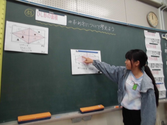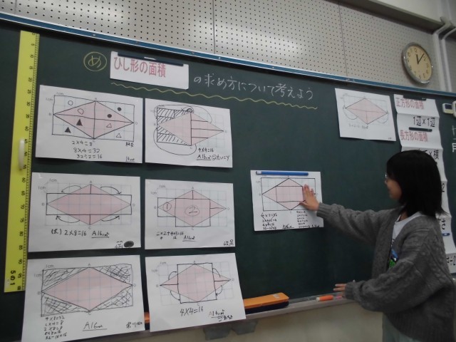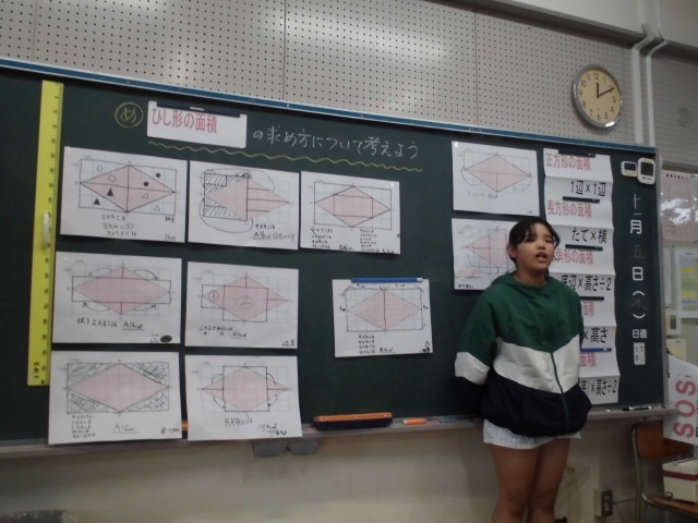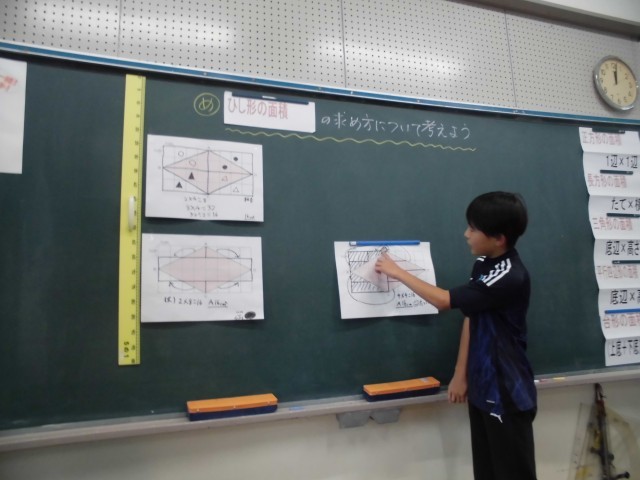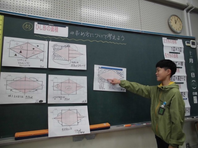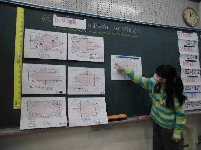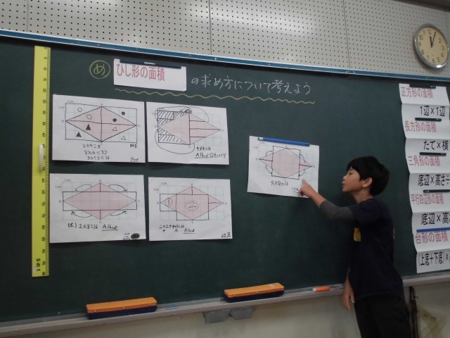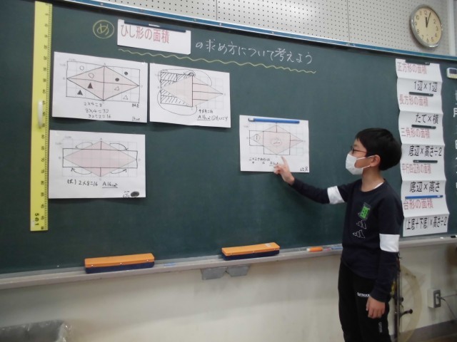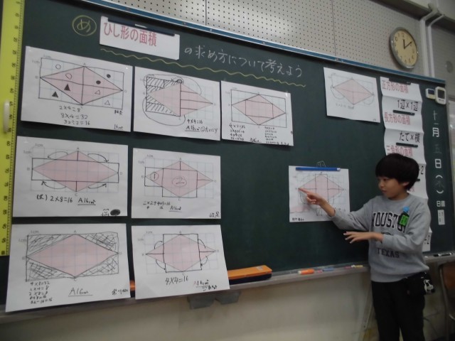 算数の授業では、昨日に続いて、ひし形の面積の求め方について考えました。今日もたくさんの子が自分の考えを発表することができました。