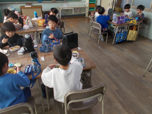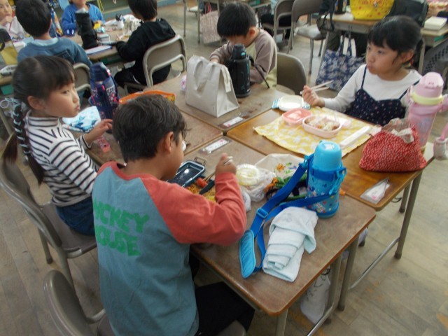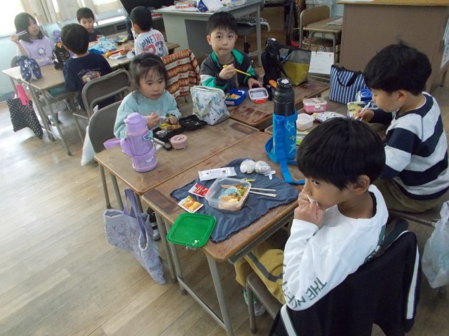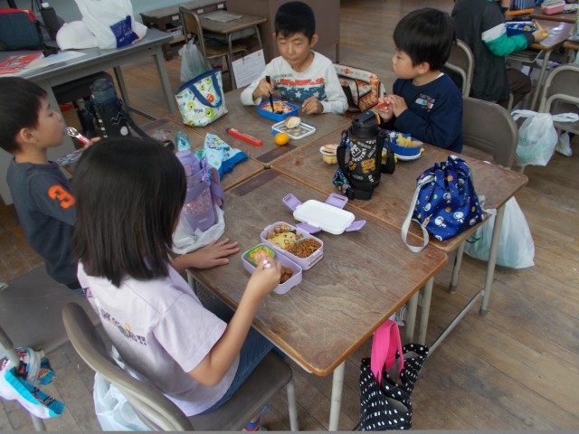 運動会で力を出しきった子どもたちはお腹がペコペコです。楽しみにしていたお弁当は、グループで机をくっつけて仲良くいただきました。