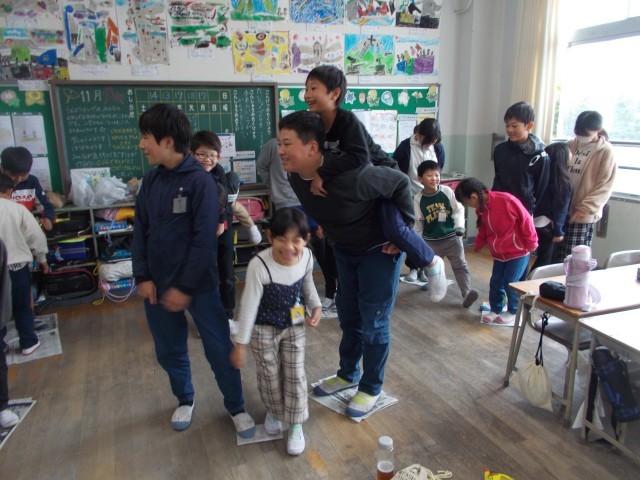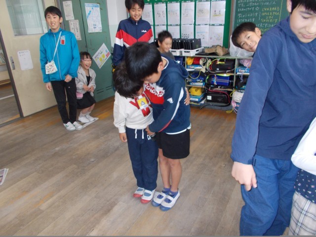 ペアの6年生と給食をいっしょにたべたあと、新聞紙をつかったじゃんけん遊びやじゃんけん列車をしました。6年生が1年生にやさしく声をかけながら遊ぶ姿が見られました。