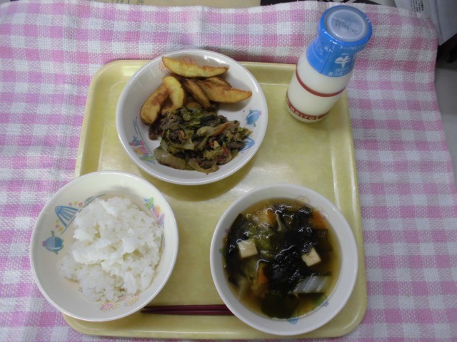 牛乳・ご飯・野菜たっぷり焼肉・ポテトフライ・わかめスープ