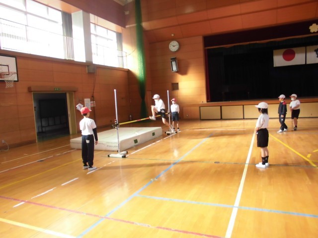 体育館の体育では高跳びの学習が始まりました。跳び方を確認した後、自分はどちらの足で踏み切ると跳びやすいのか試しました。