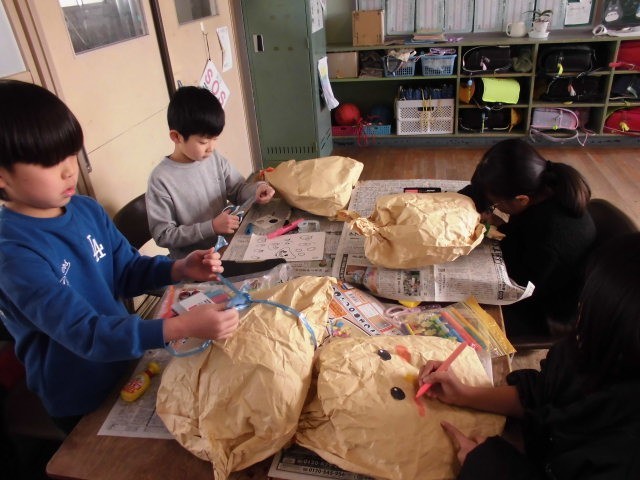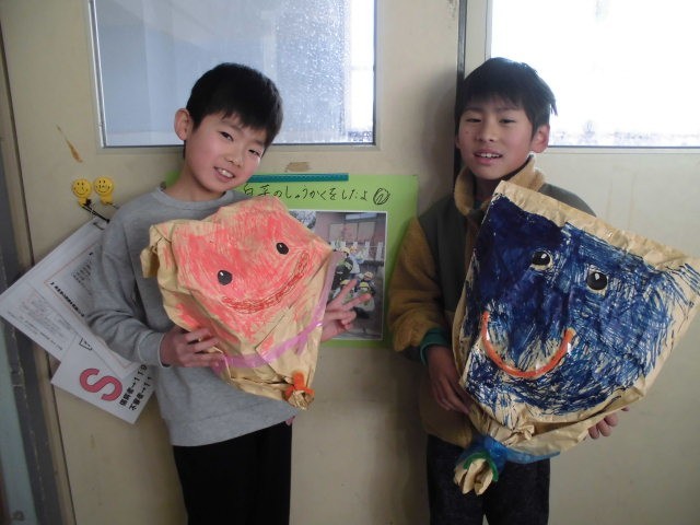 図工では、クラフト紙や新聞紙を使って作品を作りました。