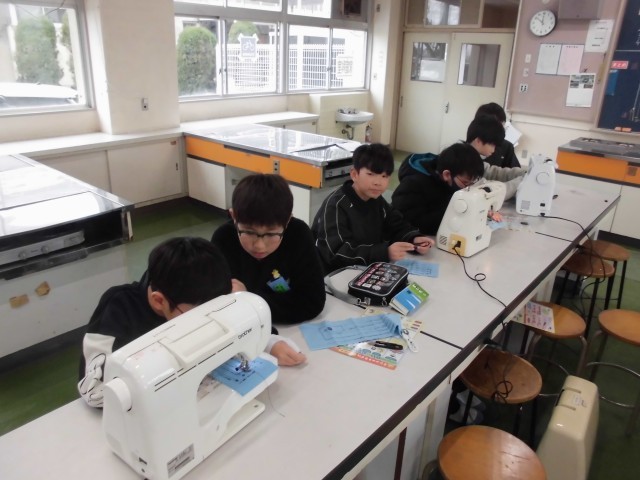 5年生は家庭科の時間にミシン縫いに挑戦しています。みんな先生の話をよく聞いて練習していました。