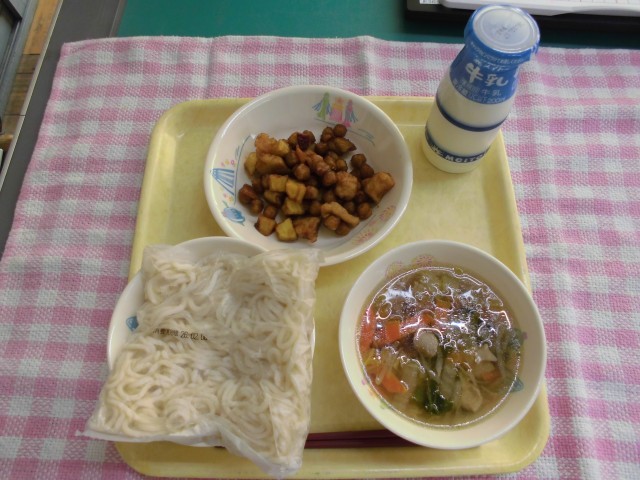 牛乳・野菜たっぷり塩ソフト麺・鶏肉とひよこ豆の黒糖がらめ