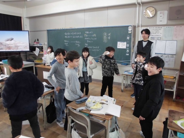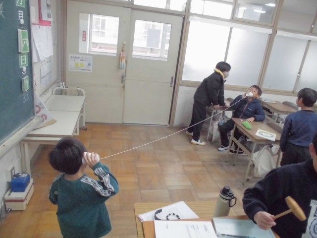 理科では「音のせいしつ」の学習をしています。今日は糸電話を作って、音が伝わる時のものの様子を観察しました。