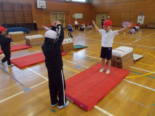 体育の授業で跳び箱に取り組んでいます。今日は、ふみこしとび、とびのり、またぎのりに挑戦しました。先生や友達のお手本をよく見て、技のポイントを確かめながら練習しました。