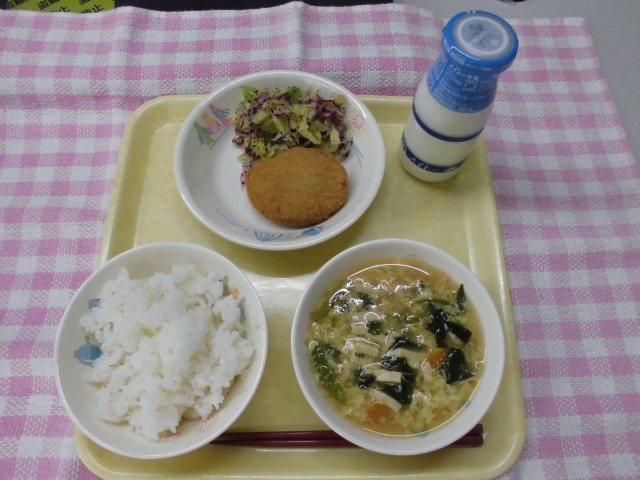 牛乳・ご飯・コロッケ・赤じそ和え・かきたま汁
