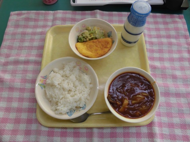 牛乳・ハヤシライス・オムレツ・蓮根サラダ