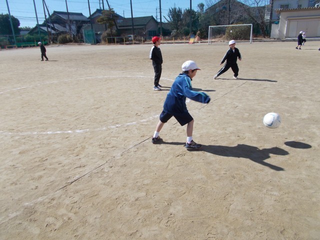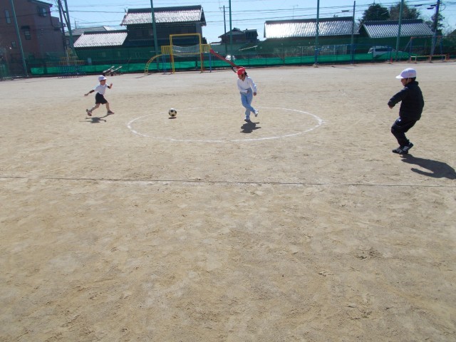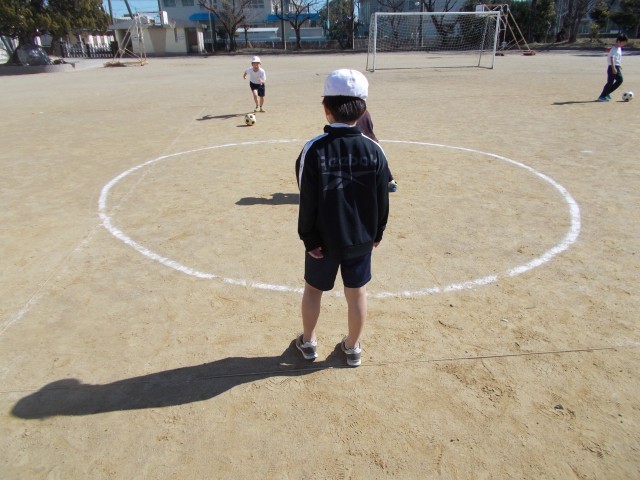 運動場でボールけりゲームをしています。今日は、三人一組になり、たまごわりサッカーをしました。中の人にボールをとられないように考えて、ボールをけりました。