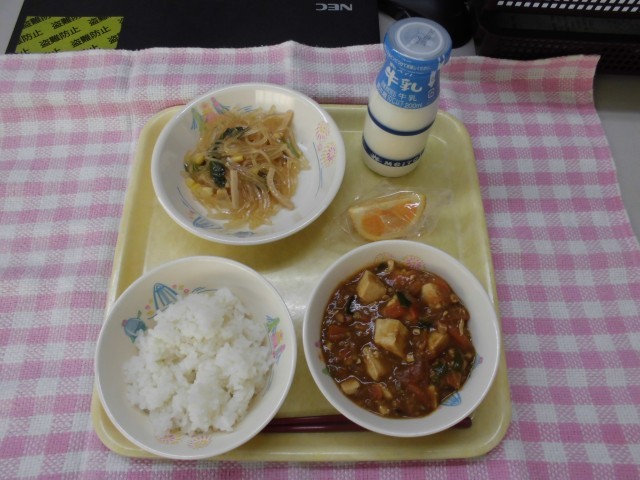 牛乳・ご飯・ヘルシーマーボー豆腐・バンサンスー・清見オレンジ