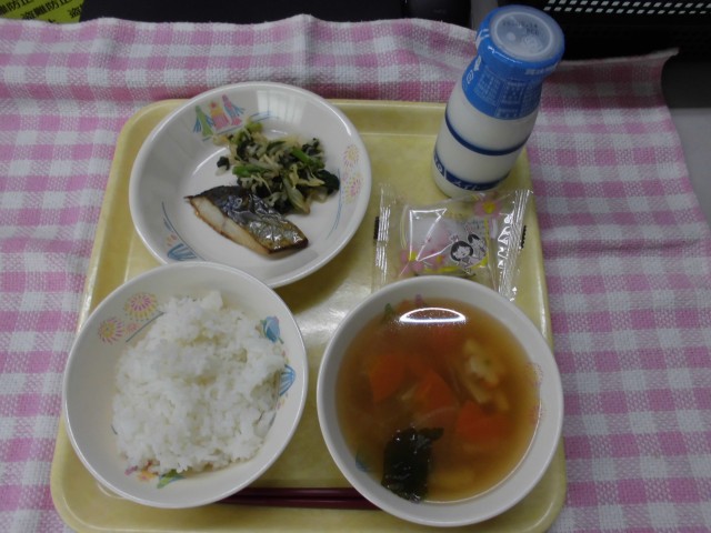 牛乳・ご飯・さわらの照り焼き・菜花のおひたし・花麩のすまし汁・いがまんじゅう