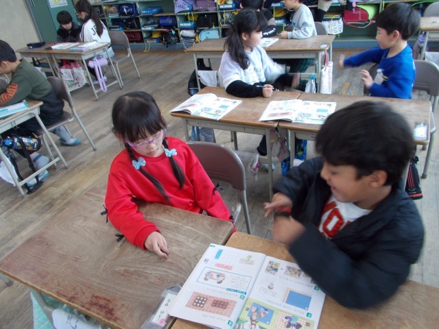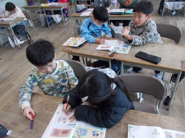 大きさくらべの学習をしました。広さを比べる方法を重ねたり、マスを数えたりすることで広さを比べられることを理解しました。