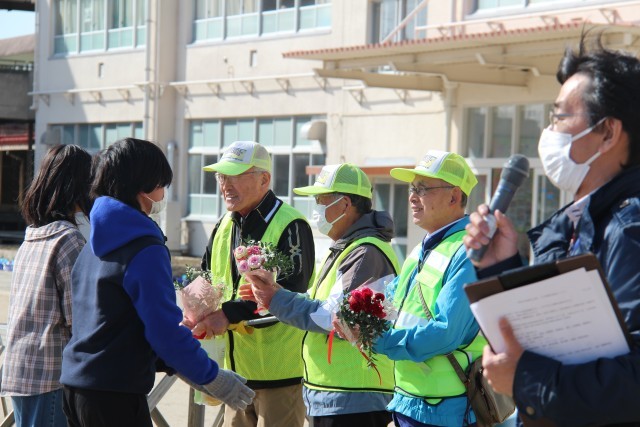代表児童の感謝の言葉、花束の贈呈等が行われました。暑い日も寒い日も雨・雪の日も朝東っ子の安全を