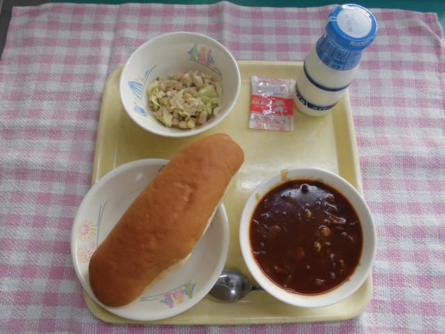 ミートボールシチューには、エネルギーのもとになる「じゃがいも」や、体の調子を整える「人参、玉ねぎ、グリンピース」などが入っています。ロールパンを小さくちぎってシチューにつけて食べてもいいですよ。まめまめサラダには、大豆、白いんげん豆、ひよこ豆が入っています。3種類の豆を見つけることはできましたか?豆類は食物繊維や鉄分が多く含まれています。苦手な人も少しは食べるようにしましょう。