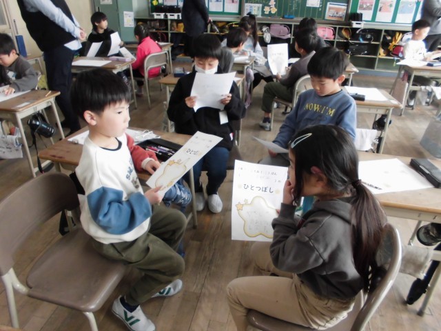 1年2組で道徳の授業がありました。題材は「ひとつぼし」。自分が一番輝けるものについて考えを深めました。