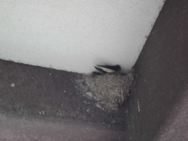 登校後、昇降口で何人かが上のほうを指さしています。つばめがいました。