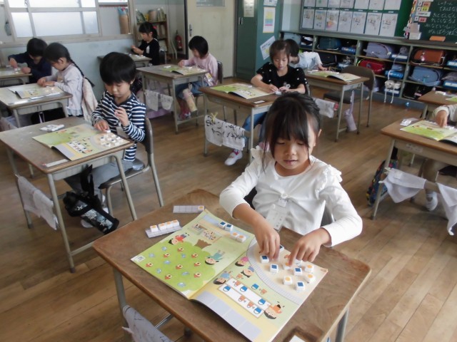 算数では、数図ブロックを使って数の勉強をしています。