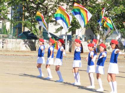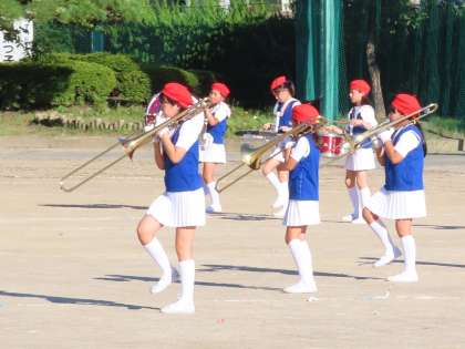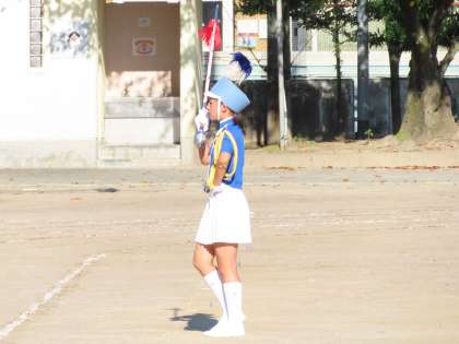 運動会に向けて、金管バンド・カラーガード部が運動場で練習していました。